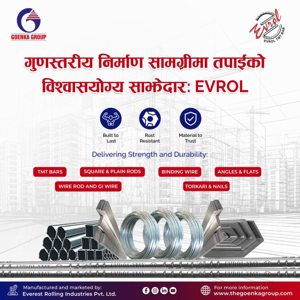 EVROL, the flagship brand of Goenka Group’s Everest Rolling Ind. Pvt. Ltd., delivers high-quality steel products with durability and precision. Committed to innovation and excellence, EVROL supports projects of all sizes across Nepal.